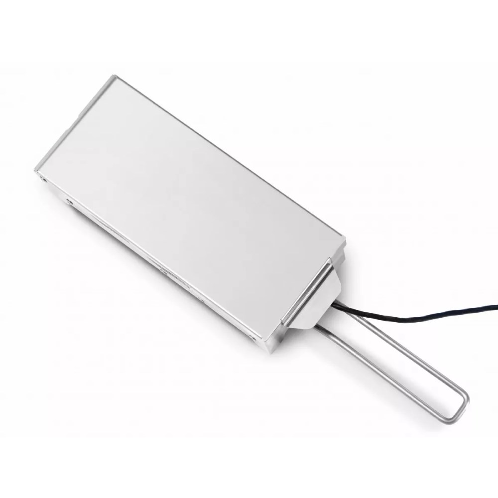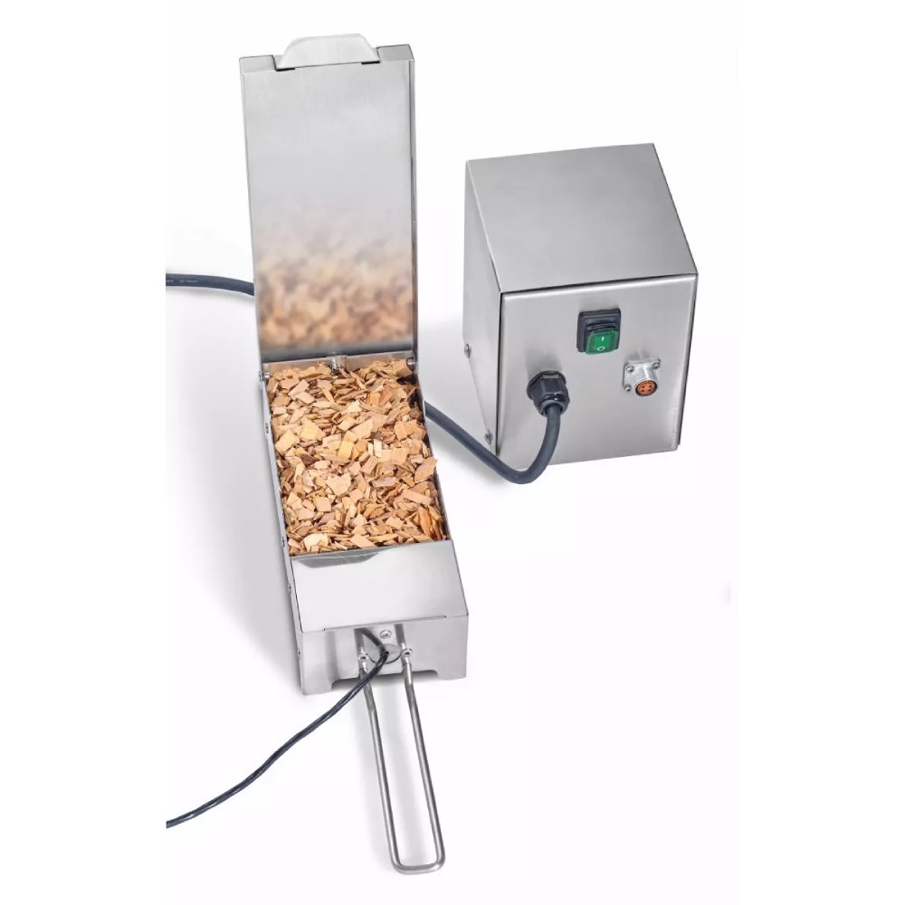 Контейнер для щепы, применяемой в процессе копчения, имеет габариты 412×120×71 мм и рассчитан на достаточный объем загрузки древесной стружки для длительной работы. Встроенный блок управления (размером 182×160×150 мм) обеспечивает простое и понятное управление параметрами копчения. Панель позволяет изменять подачу дыма и контролировать процесс, гарантируя равномерное распределение дыма в пароконвекционной камере.