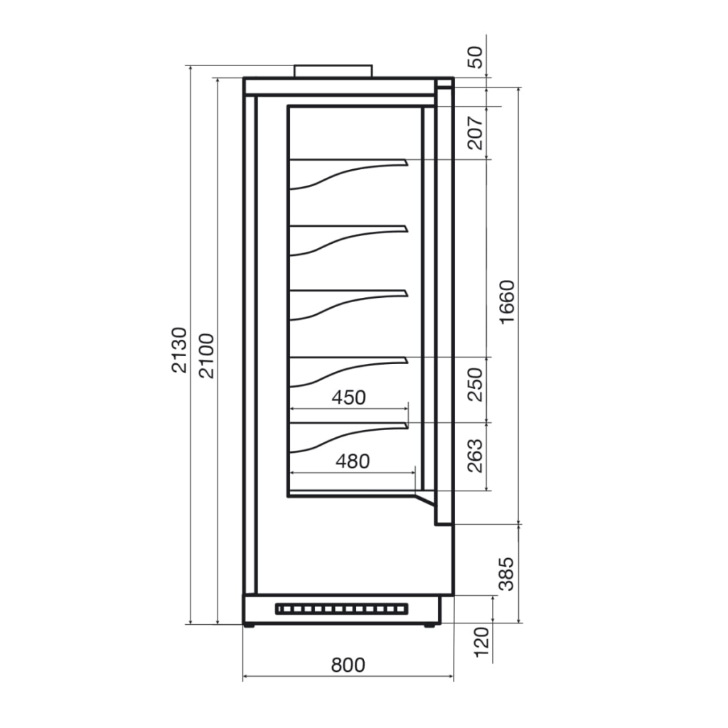 Модель оснащена пятью рядами полок с ценникодержателями и вертикальной LED-подсветкой, обеспечивающей равномерное освещение каждого уровня выкладки. Двери из стекла с теплотражающим покрытием минимизируют потери холода и предотвращают образование конденсата.