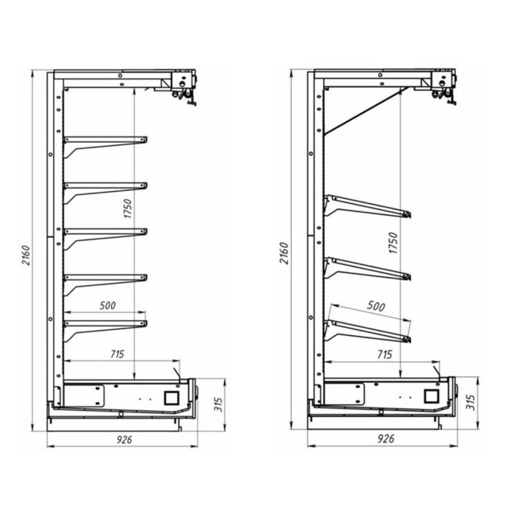 Полочные модули: 5 полок глубиной 500 мм, с регулируемым наклоном, проволочными ограждениями и ценникодержателями на каждой.