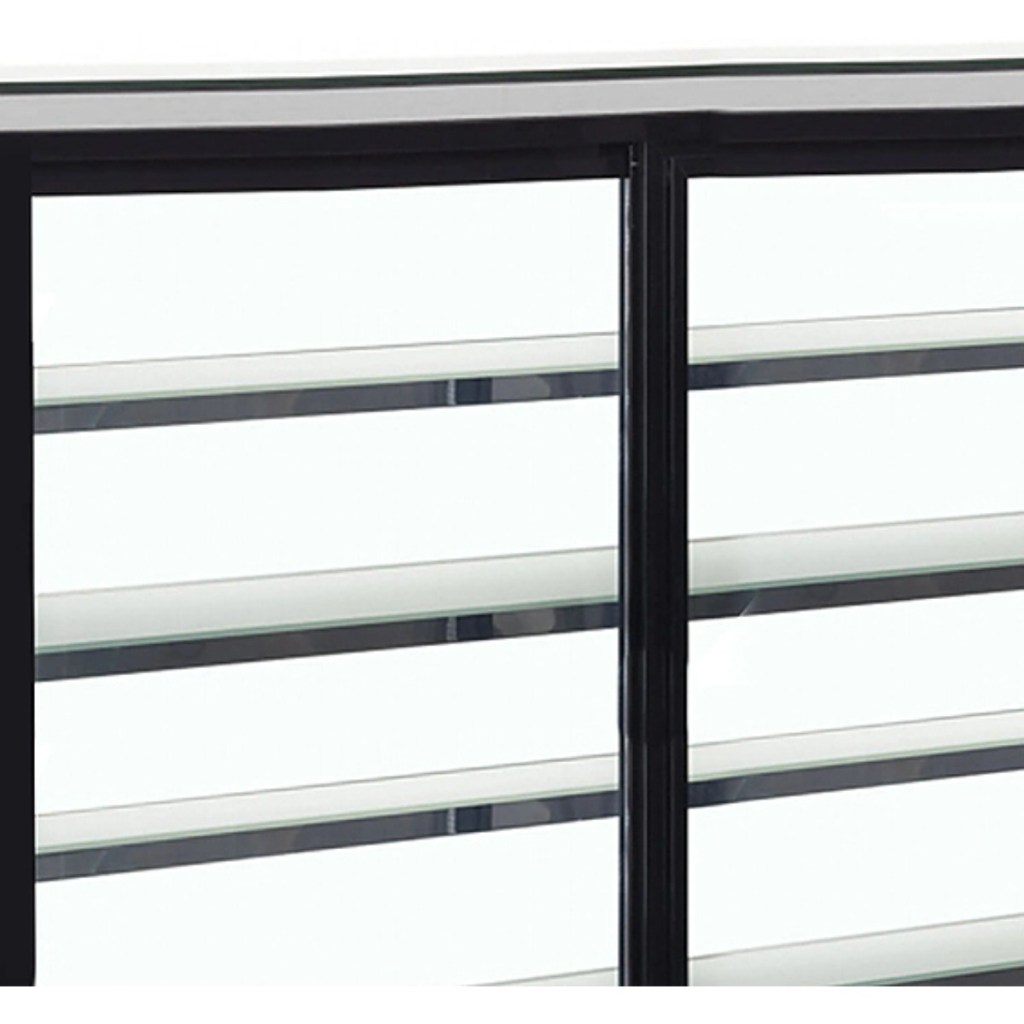 Витрина оснащена двумя раздвижными дверцами со стороны продавца, дополнительным полочным пространством и светодиодной подсветкой каждой полки, что делает продукты максимально заметными для покупателей. Купол выполнен из нержавеющей стали и прямого стекла, а дверцы, полки, основание и рама — из прозрачного стекла, что облегчает уборку и уход.